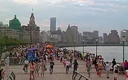The Bund extends along the West bank of the Huangpu River and offers an excellent view of Pudong's skyscrapers on the East side. Photos of that view are very common, perhaps the best-known image of Shanghai. We have one in the Pudong article. Shanghai's Old Town (南市 Nanshi) is located next to the southern part of the Bund. Nanjing Road, a major shopping street, heads west from the Bund's centerpoint at the Peace Hotel.