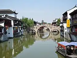 • 🌍 Qibao ancient town (七宝古镇 Qībǎo gǔ zhèn) (metro line  9  to Qibao station (七宝镇), take exit 2 and walk towards the road junction. Turn left at the junction and walk a few hundred meters south; the entrance to Qibao town is a huge gate on your left. Alternately, bus lines 4, 87, 91, 92 or 911 stop near the gate.). Qibao is a small town about two square kilometers in size which is crossed by two canals. Around the canals, a large number of traditional houses, shops and restaurants are found. Tourism has been actively encouraged and it makes a good daytrip from central Shanghai. Although Qibao can be touristy, prices are comparatively cheap. Qibao temple and pagoda (七宝教寺, 七宝塔), only ¥5 to enter and not very touristy, is in the east of the town, and the Qibao distillery (七宝酒坊) is at the center of the city. A quiet boat ride around one of the canals is ¥10. Embroidery from Mrs. Xie Ju Fang, who moved from the embroidery capital Suzhou, and is now making her lovely artwork in her shop, No.70 Fuqiang Rd. Free to enter. OSM directions