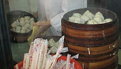 - Nanxiang Steamed Bun Restaurant (Nanxiang Mantou Dian) (Near the zigzag bridge opposite the tea house). Founded in 1900, this is the best-known restaurant specializing in small soup-filled buns called Xiaolongbao (also commonly referred to as "soup dumplings"), a characteristic Shanghai snack. This restaurant is popular for take-away and sit-down. The sit-down section (up the stairs) has a range of options - from the cheapest first floor dining room where you sit elbow-to-elbow with other patrons, to the "VIP section" with a large minimum spend. As a guide, the higher you go, the more expensive the offerings: for example, the first floor dining room serves pork and crab meat buns and simple shredded egg soup, whereas the third floor dining room serves crab roe and soft roe buns and egg and scallop soup. The line for take-away is quite long and takes 90 min or more before soaking your teeth in some of the best (and cheapest) ones in Shanghai. Be careful not to scald your mouth with the hot liquid. ¥20-60.