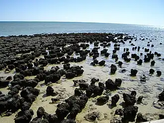 • 🌍 Hamelin Pool is the east, larger lagoon within Shark Bay, and it too is calm and hypersaline. This has enabled the growth of stromatolites, gnarly cannonball concretions of cyanobacteria, sand and shell fragments. Cyanobacteria are one of the oldest known lifeforms, using an ancient variant of chlorophyll, and they oxygenated the earth's atmosphere some 2.4 billion years ago. Some fossil stromatolites in Marble Bar, Pilbara, are even older than that, but those here might be 8000 years old - that's when rising sea levels flooded the bay after the ice ages. The stromatolites are reached by a side-road from Hwy 353: they're fragile, so stay on the boardwalk. The old telegraph station has been converted into a museum, and there's a caravan park.