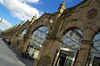 - 🌍 Sheffield Station (Sheffield Midland), Sheaf Square, S1 2BP. The city's central station. You can reach the city centre on foot via Sheaf Square and Howard Street in 10-15 minutes' uphill walking, or in about five minutes by tram. Supertram services stop at the station (Sheffield Station / Sheffield Hallam University), at the far end from the main entrance of the pedestrian bridge that crosses over the platforms. There is a lift from the station concourse and platforms, and several places to buy food and drink. Toilets on several platforms are free to use, whereas the toilets on the main concourse charge 50p. There is no left-luggage service or lockers. Most long-distance coaches and many city buses stop at Sheffield Interchange, two minutes' walk from the station: cross the pelican crossing and walk through the covered walkway.