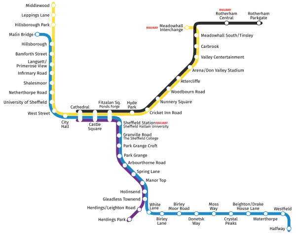 - 🌍 Halfway Park and Ride, Eckington Way, S20 3GW (on the B6053, 10 min from the M1 J30, via the A6135 and B6058). 190 parking spaces. Served by Supertram Blue route every 10 min during the daytime. 1 day: £4.50; 1 week: £18; buy from machine - ticket valid for one return tram journey.