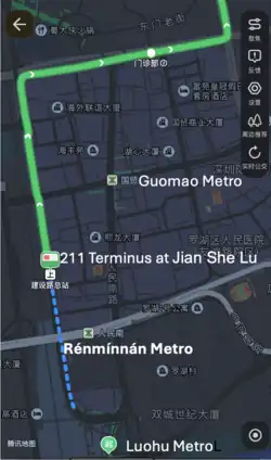 Map showing the 6 min walking route from Luohu Metro station to the 211 bus terminus on Jian She Lu