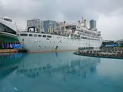 - 🌍 Shekou Sea World (蛇口海上世界, Shékǒu Hǎishàng Shìjiè), 1128 Wanghai Road, Shekou 蛇口望海路1128号 (Sea World metro station, exit A). A shopping/entertainment complex which has nothing to do with the US marine animal park. In 1984 Shekou was booming and there was a serious shortage of accommodation. To deal with this, the cruise ship "Ming Hua" (commissioned in 1962 in France) was moored alongside the dock and used as a floating hotel. Only nine years before it had been the focus of a political typhoon during the movement which saw Deng Xiaoping sent for the second time into political limbo. No wonder that he was happy to write an inscription in his own handwriting, "Sea World", a facsimile of which now presides in neon over the ship. The land has now been reclaimed for half a mile beyond the ship which now sits in a shallow pool. But the attractive square in front of the ship is surrounded by restaurants and coffee shops designed to evoke foreign lands like Europe, and successfully so, with the result that it's very popular among Shenzhen's expats. A restaurant in the ship named The Ex Ta Sea has pool tables and table football. You can also rent an electronic animal ride or a triple-seated bike. In front of the ship there is a little dome, and there are shops all around the edge. You can buy toys, magic tricks, and various goods. Behind the ship, there is a golf course. This is a very happening place where a lot of celebrations are held. Various international restaurants like sushi, Dunkin Doughnuts, Mexican food, German bakeries and pizza. In the center of Sea World is a smooth tiled center where people ride their bikes, skateboards and scooters.