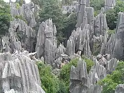 Shilin (石林, Shílín) karst region, the "Stone Forest", is a national park in Kunming Prefecture, Yunnan province in southern China. The huge pillars of stone, formed by erosion, look like something out of a fantasy film. The park is large, too big to see all of it in one day. It has several different areas and many interesting nooks and crannies, and you can easily lose yourself on the winding paths between the huge rocks.