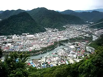 Shimoda (下田) is a city on the Izu Peninsula in Japan. It is famous as the place where Commodore Matthew Perry of the U.S. Navy arrived with his "black ships" in 1853. This led to the signing of the Convention of Kanagawa, effectively ending Japan's 200-year era of isolation from the outside world.