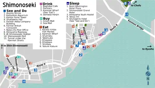 - 🌍 Shimonoseki Tourist Information Center (下関観光情報センター, Former Akita Company Building), 23-11 Nabe-cho, ☏ +81 83-231-4141. 09:30-17:00.