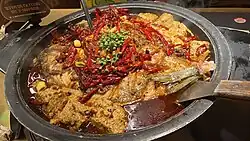 One specialty of the area is the Hot Pot (火锅 / 火鍋, huǒguō), a sort of wide-mouthed soup pot into which an assortment of vegetables and thinly sliced meats are dropped to cook. Typically, the pot has two parts separated by a partition; one side is extremely spicy, the other milder.