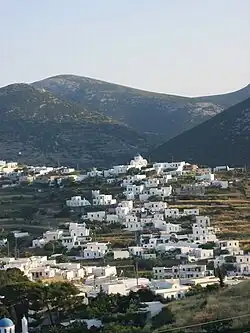 - The island capital of Apollonia is part of a complex of clustered villages spread along a hillside which merge into one another. It's where most shops and services are, including banks, the post office, and a number of tourist-oriented shops and bars. There is a mini-"scene" there on summer evenings with locals and tourists going among the tavernas, cafes, and other establishments. There's an interesting Folk Art Museum (open daily April to October tel ☏ +30 22840 33730) in the main square. The other major village of the cluster, farther up the hill, is Artemonas, less lively but more atmospheric with cubistic Cycladic architecture than Apollonia. The walk between the two is steep but only takes about twenty minutes, and offers many beautiful view points.