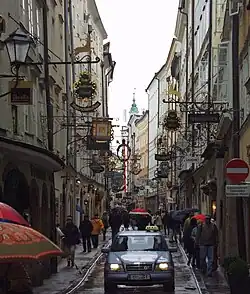 "Guild signs" (or modern replicas made to look like them) are another favorite. Often, they protrude into the street at a right angle to be better visible. Examples include a distinctive striped "barber pole" (or a pair of scissors) for barbers, a pretzel for bakers, animals for butchers or restaurants. They are often used to invoke (real or proclaimed) tradition going back centuries and a "down home" feeling of the "good old days".
