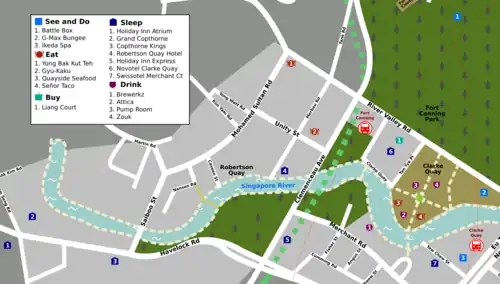 Singapore's nightlife is almost entirely concentrated near the river. The main areas are Boat Quay, on the south of the river next to the financial district (MRT Raffles Place, exit G) and Clarke Quay on the north bank a few blocks inland (MRT Clarke Quay or Fort Canning). Less well known but also worth a look are Circular Road, parallel to Boat Quay just behind it, and Robertson Quay, at the western end of the river. Bars and pubs come and go with dizzying speed, so just head out and find today's hip spot. All four are within crawling distance of each other.
