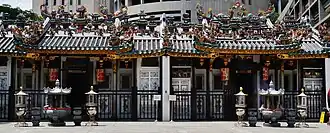 εΊ), 30B Phillip Street. 8AM-5PM daily. Also known by its Teochew name Wak Hai Cheng Bio, this is the oldest Teochew temple in Singapore, and dedicated to the Taoist goddess Mazu. Look out for the traditional Teochew architectural features of the temple, including the intricate carvings on its walls, and the distinctive "curly grass roof". What distinguishes it from typical Teochew temples in China is the large number of colourful ceramic figurines on its roof depicting scenes from Teochew opera. The temple is home to a plaque bearing the inscription "ζζ΅·η₯₯ι²" (lit. Peaceful clouds over the Ocean at Dawn), presented by Emperor Guangxu of China in 1899, making it one of only two temples in Singapore bestowed with this honour. Free.