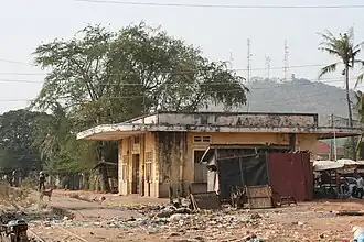 The then-derelict Sisophon railway station before renovation, with the watchtower on Phnom Bak, behind.