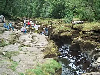 - The Strid: the woods on the Bolton estate are an ancient forest of sessile oak. The Strid itself, a short walk from the Abbey car park, is where the River Wharfe suddenly narrows into a deep torrent six feet wide, so you could almost stride across, but not quite. The name is fatally misleading, it's from Old English stryth meaning "don't try to stride across, you'll be killed to death." The whitewater difficulty rating is 5-ish because of underwater ledges where the current traps anyone who falls in. With high water it's 5- and a kayak might scoot through; with lower water it's 5+ and you'd better portage.