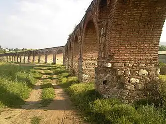 - 🌍 Skopje Aqueduct (Скопски аквадукт). Located within the village of Vizbegovo, this is the only aqueduct archaeological site in North Macedonia and one of three in the former Yugoslavia. Its date of construction is not known; it may have been built as early as Roman times or as late as early Ottoman rule. The stone and brick structure was used as an aqueduct until the 18th century. Today, 386 meters (1,266 feet) consisting of 55 arches remain. It is on the Serava River and, presumably, carried water from a spring in the Skopska Crna Gora to the city centre.