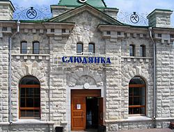 - 🌍 Slyudyanka-1 (Слюдянка I), ул. Тонконога, 18. The main station, doubling as one of the town's landmarks. It's more "touristy" than average Russian railway stations as it has a small museum but not a proper waiting room. It's also on the Baikal side of the railway; to reach the commercial side of the city you need to cross the long pedestrian bridge across the tracks. There are several kiosks on the platform.
