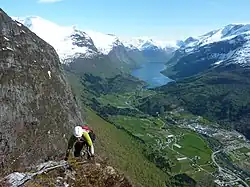 Via Ferrate above Loen village, Loen lake in the background. Mid-May and still snow on the summits.