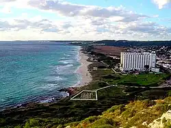 The beach at Son Bou is the longest on the island - some 3 km of golden sands. The dunes are fenced to deter access, as part of a dune regeneration programme. Behind the beach is an extensive area of wetland, comprising open water and reed beds. This is a protected nature reserve containing many species of birds, amphibians and insects. The beach is very popular with naturists of all ages. There are three beach bars that serve food and drinks.