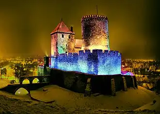 - 🌍 Będzin Castle, Zamkowa 1, Będzin, ☏ +48 32 267 4731. Tu-F 09:00-16:00, Sa Su 09:00-17:00. Completed in stone in 1348 over the site of a wooden castle, this guarded the western frontier of Poland. Later the frontier lay elsewhere so it lost its importance, and became tumbledown in spite of repairs. It was refurbished as a museum in 1956.