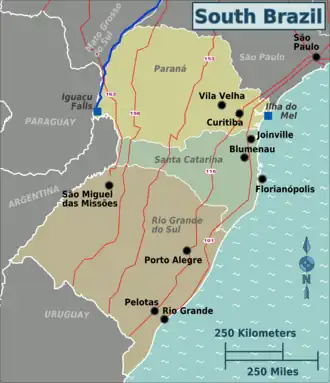 The South is the smallest of Brazilian regions, and also, economically speaking, one of the most developed. It borders Uruguay, Argentina and Paraguay. It also received most of the immigrants from Italy, Germany and other European countries such as Poland and Ukraine in the 19th century.