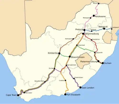 - π Upington β located in the arid Northern Cape province, this city is a good base when exploring the Kalahari desert and the national parks located in the Northern Cape.