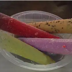 - Kulfi is a frozen dairy dessert eaten across all South Asian countries with its popularity stretching as far as Myanmar. Often dubbed "Indian ice cream", its taste for the most part will remind you of ice cream though there are a few key differences. Kulfi is made from evaporated milk and sugar does not contain eggs and is not whipped or aerated. As a result, kulfi is denser, creamier and slower to melt than ice cream and can have a slightly chewy texture. The most common shape of kulfi is a long, thin cone. When you buy it from stalls or trucks on the street it is usually served on a stick, while in restaurants it is given in a cup or plate. The traditional flavours include malai (cream), cardamom, rose, pistachio, mango and saffron. For those with allergies, keep in mind that even non-nut flavours often contain nuts (almonds, pistachios and cashews being most common). Nowadays, much like ice cream, you will find hundreds of flavours as you shop around and go to different vendors.