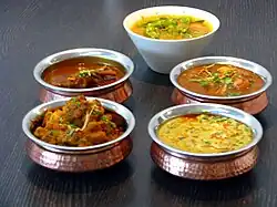 In many restaurants across South Asia as well as South Asian restaurants abroad you will come across a type of meal called a thali or bhojanam. Literally meaning large plate, thali also refers to the meal served on the large round plate or platter. Thalis consist of multiple dishes presented either in small bowls or built-in compartments within the plate.