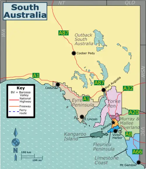 - Princes Highway (B1) to the southeast of the state, the Coonawarra wine region in the south east of the state, Mount Gambier and on to Victoria