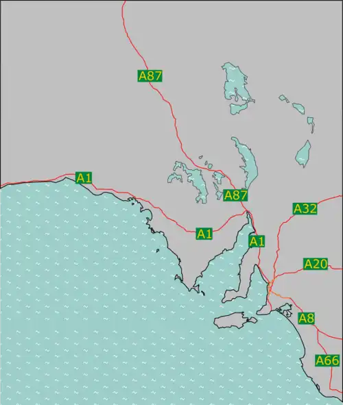 Though the state has a good network of highways, the state's freeway (or expressway) network is well under par compared to other states, both in the metropolitan areas of Adelaide, and in regional South Australia. It has the least kilometres of freeways of any state, including Tasmania. All up, it has less than 200 km of freeways, and all freeways begin in the outer suburbs of Adelaide and end in the nearby country towns β for comparison, the length is comparable to tiny countries like Singapore or Cyprus. Due to the state's limited freeway network, there are only two major freeways that head well out of Adelaide: the M1 South Eastern Freeway towards the southeast of the state and towards Victoria but only for 70 km before it becomes a two-lane undivided highway (single carriageway) and the M2 Northern Expressway/A20 Sturt Highway northeast towards NSW and Mildura, and that too, only for around 65 km before it becomes a two-lane undivided highway. A third freeway, called the M2 Southern Expressway, runs for 18.5 km through the southern suburbs of Adelaide, and is useful for getting to Victor Harbor and Kangaroo Island but ends just before the Onkaparinga River. There is another road that is not exactly a freeway, but a four-lane undivided highway (dual carriageway): the A1 Port Wakefield Highway northwest from the outer north of Adelaide to Port Wakefield which is about 70 km.
