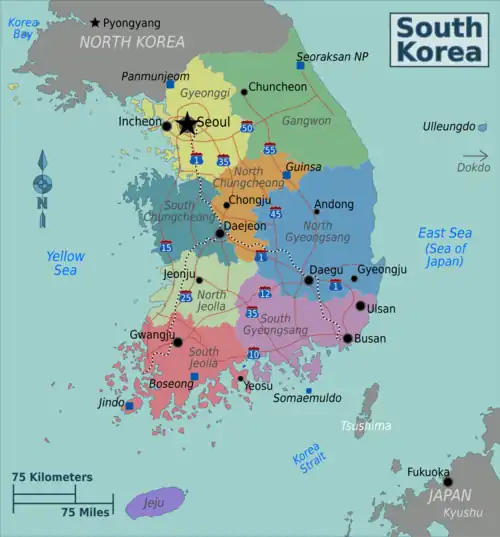 South Korea is divided into nine provinces as listed below, with their commonly used Korean abbreviations in parenthesis. The largest cities are separate government areas, but Wikivoyage includes them in the most relevant province.