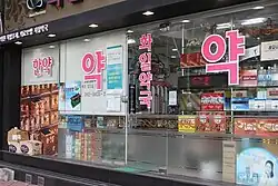 A Korean pharmacy, with the word 약 (Yak) prominently displayed