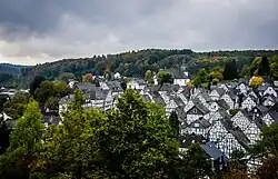 South Westphalia (German: Südwestfalen) is a region in North Rhine-Westphalia, Germany. It consists of Sauerland, Siegerland and some smaller sub-regions and is the most sparsely populated region of the state. The landscape is characterised by rolling hills and (low) mountain ranges, making Sauerland and the Rothaar Mountains one of Germany's northernmost skiing areas. Beyond winter sports, the region is popular for hiking, camping and its small and romantic historical towns.