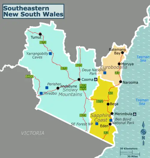 Australia's Highway 1 (the ring route around the country) also passes Eurobodalla and the Sapphire Coast, but not the Snowy Mountains.