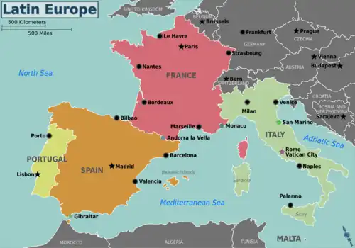 Southwestern Europe is a region in western and southern Europe. It can be referred to as Latin Europe as, generally speaking, Romance languages and the Roman Catholic Church are endemic, through the heritage of the Roman Empire. The region contains Portugal, Spain, France, Italy and Malta as well as some of Europe's smallest countries: Andorra, Monaco, San Marino, and the Vatican City. These countries have around 180 million inhabitants all told.