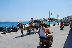 With private cars banned from the island, local transportation is very expensive (although most attractions are within reasonable walking distance). In high season there are two buses connecting the town with the beaches of Aghioi Anargyroi and Aghia Paraskevi on one side and Ligoneri on the other side. Other land transportation includes four taxis and several horse-drawn buggies (high season only). Plenty of bikes and motorcycles are available for hire.