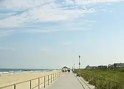 The Boardwalk is a two-mile elevated walking platform where entrances to the beach are blocked by badge checkers. The two pavilions (North & South) have bathrooms, food and tourist goods for sale.