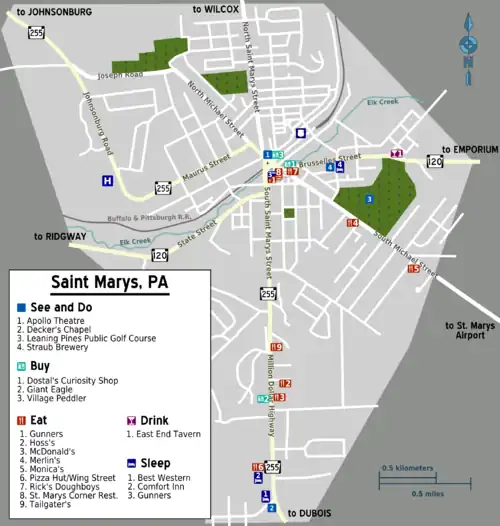 Getting around St. Marys is straightforward and confusing at the same time. As far as major routes go, it couldn't be simpler; Route 255 comes in from the northwest (Johnsonburg) and leaves to the south (DuBois); Route 120 comes in from the west (Ridgway) and leaves to the east (Emporium). Where it gets tricky, however, is at the intersection in the middle of downtown where those two routes meet. It's a triangular plot of land called the Diamond, and in addition to the two state routes, the railroad tracks, Elk Creek, and multiple local roads all pass through.