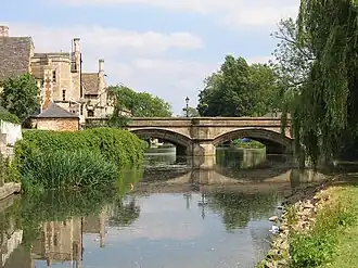 - π The Meadows west of Town Bridge are the floodplain of the River Welland. They're the tip of a river island, and popular for picnics. A walk upriver leads to Tinwell village: the "Melancholy Walk" may be named for the gallows that once stood here, but the monks could be lugubrious on any occasion. The south fork of the river became a millstream, and the area has for centuries been used as part of flood defences - Stamford is only a few feet above sea level. Downstream is canalised but not navigable since 1863.