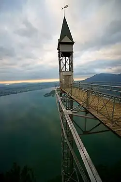 The top of the Hammetschwand lift.🌍Hammetschwand Lift.Summer months 09:30-11:30, 12:00-17:30.A 152m (499ft) high outdoor glass lift bringing you up to the top of the Bürgenstock where a great view and a restaurant awaits you. If you don't want to pay for the lift, it's also possible to walk up by foot.Single/return Fr. 10/13.(updated Sep 2017)