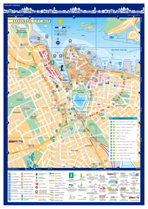 The most scenic and interesting part of Stavanger for visitors is the waterfront area of town surrounding the inner harbor like a big "U", all of which is quite walkable. On the west side of the inner harbor is the old town with two museums. Also the Tourist Information Office in Stavanger is located at Strandkaien, next to the harbor between the cruise pier and the historic Old Stavanger. The TI office, open 08:00 - 18:00 in the summer, is a good source of free advice, brochures, maps, and wifi. On the east side is also lots of shops and restaurants, as well as the Petroleum Museum. At the bottom of the "U" is the market plaza and the Stavanger Cathedral. South of the Cathedral is the man-made Lake Breiavatnet, which separates the harbour area from the train and bus stations and more museums. To go much farther afield, some form of transportation might be useful.