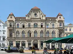 The famous historic town centre built around the Stadtplatz (town square) was largely restored following World War II. Its best-known piece of architecture is called the Bummerlhaus which is considered one of the finest examples of Gothic architecture for its size in Central Europe.