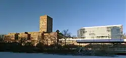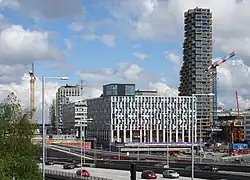 Hagastaden is a neighbourhood with trailblazing 21st century architecture, scheduled to be finished around 2030. The dominant institutions are Karolinska University Hospital and Karolinska Institute. The tallest building is Innovationen at 120 metres above ground level. Its twin tower, Helix, reaches 104 metres.