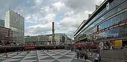 - 🌍 Sergels torg. Stockholm's busiest city square. The black-and-wine Harlequin concrete floor was laid in the 1960s. For decades, the place had bad reputation for drug-dealing and violence; a redevelopment of the street level finished in 2018. The square is a natural meeting point, attracting thousands of people daily for meet-ups, political protests, flash mobs, and retailing.