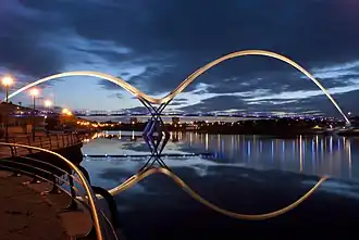 - 🌍 Infinity Bridge is a footbridge and cycleway spanning the Tees between Durham University Queen's Campus on the south bank and the business park on the north bank. Opened in 2009, it's a striking double bow, best seen at night in calm conditions when the reflection of its lights in the river makes the ∞ infinity symbol.