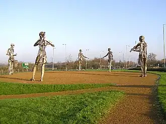 - π "The Tinneys" is the local name for the street sculpture "Let the dance begin." They're five 20-foot steel figures northwest edge of town, where A38 branches off A5 to cross the river into the Republic. They were commissioned to celebrate the relaxation of the border, the "dance" being the re-united communities.