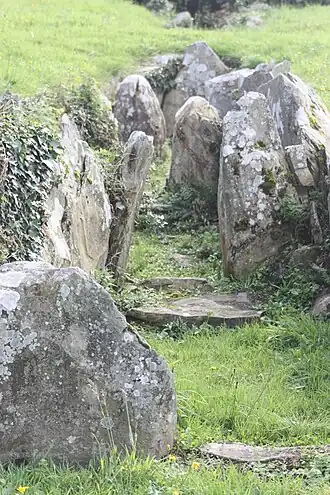 - ð Audleystown Court Cairn, BT30 7LP. 24 hr. This was found to contain human and animal bones plus Neolithic pottery. It's 27 m long, now roofless, with dry-stone walls ("revetting") on the gallery sides. At each end a forecourt gives access to four burial chambers. Free.
