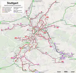 Stuttgart's public transportation system comprises two light rail system - the Stadtbahn (or U-Bahn) and Schnellbahn (S-Bahn), as well as a city bus system. It is managed by VVS and is fully integrated in that there is one fare and ticketing system for all forms of transit, so that a single ticket can be used on any mixture of buses and trains that may be required to complete the journey. The VVS's network called is divided in zones. The city of Stuttgart is only Zone 1. Most lines will lead via Hauptbahnhof, ending in a layout that is pretty centralised: If you want to go somewhere, chances are, you have to ride via Hauptbahnhof. The following Stadtbahn or S-Bahn stations are in the heart of the city: Hauptbahnhof, Schlossplatz, Charlottenplatz, Stadtmitte (Rotebühlplatz), Feuersee, Rathaus, Staatsgalerie and Berliner Platz (Liederhalle). For a complete description see the official map of VVS-network.