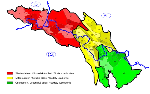 The Sudetes or Sudetes Mountains (in Polish and Czech Sudety, which is a plural proper noun) is a mountain range in Poland and the Czech Republic. In Czech, the word "Sudety" or its English equivalent refers to a much broader region Sudetenland, which includes basically all area in Bohemia near the border with Germany and Austria. If referring this region to a Czech person, it is probably better to use term Sudetes Subprovice (Krkono拧sko-jesenick谩 subprovincie) or not referring to this region at all and use the names of mountains that is consists of.
