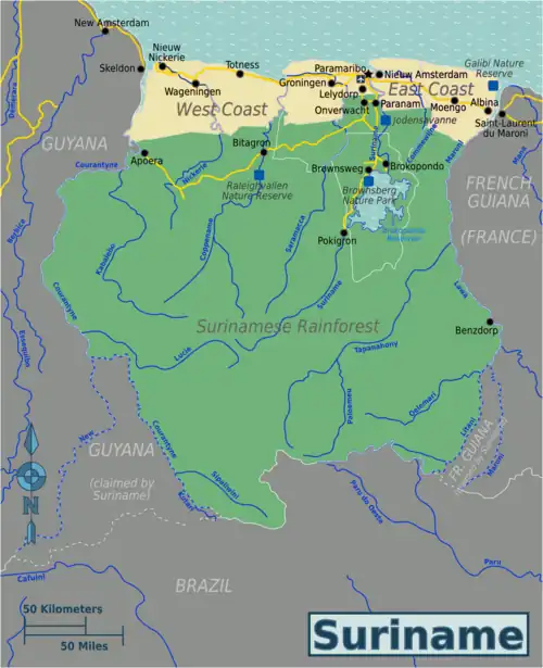 - Blue Wing Airlines, Airport Zorg en Hoop, Paramaribo, ☏ +597 434393, sales@bluewingairlines.com. M,W,F 11:00. Be present at 10:00. On Friday and Monday, Awarradam group travellers leave and return. €124/€224 single/return.