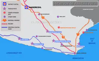 Mutta pathi - The place is located 2 km (1 mi) north-east to Kanyakumari. This is a Ayyavazhi holy site from the event that Ayya Vaikundar conducted the Thuvayal-Thavasu to train the devotees to be strict vegetarians, to eat only once a day (raw rice and green gram), to wash clothes three time a day and lead a holy life. The sea near this site is traditionally called the 'milk-ocean'. This is the sea where Lord Vaikundar plunged into to get the Vinchai.